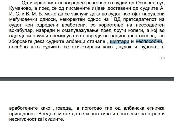 “Veç tjerash në raste të caktuara përdorë nënçmime në baza kombëtare, konkretisht kualifikime se gjykatësit shqiptarë janë bërë “shiptari të paaftë”, ndërsa gjykatësit e tjerë etiketohen si “i çmendur” dhe “e çmendur”, ndërsa të punësuarve në gjykatë i referohet me “gjedhe”.