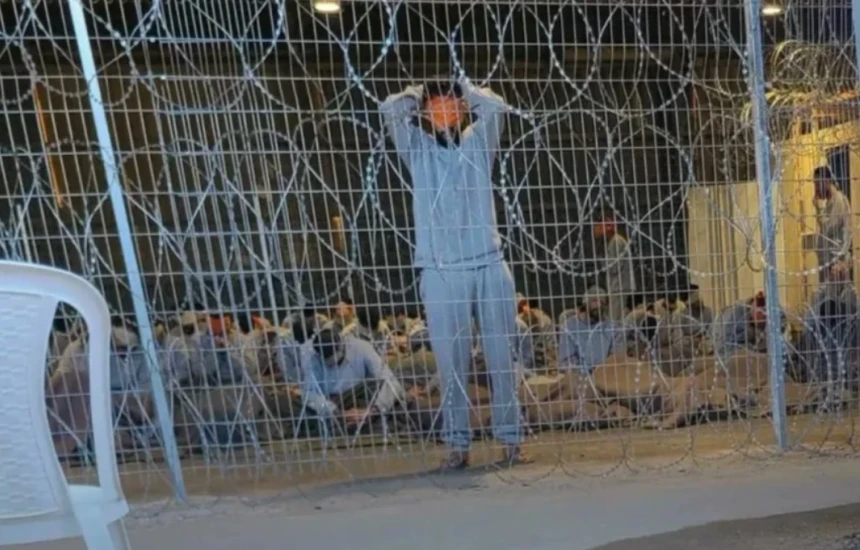 Në një bazë ushtarake në shkretëtirën Negev të Izraelit, që tani shërben si qendër paraburgimi, është shkrepur një foto e skenës. Aty shihet i burgosuri me sy të lidhur, Ibrahim Salem. Salem tashmë është liruar nga burgu dhe rrëfen për abuzimin dhe torturën seksuale që ka përjetuar nga ushtria izraelite.