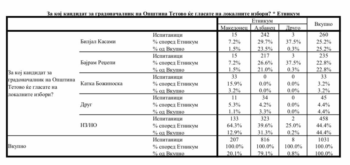 Sipas të dhënave të sondazhit, komuniteti maqedonas në Tetovë është i ndarë në dy pjesë pothuajse të barabarta, gjë që nënkupton se partia VMRO-DPMNE nuk arrin të ushtrojë ndikim të plotë mbi elektoratin e vet për ta orientuar drejt mbështetjes së Kasamit.