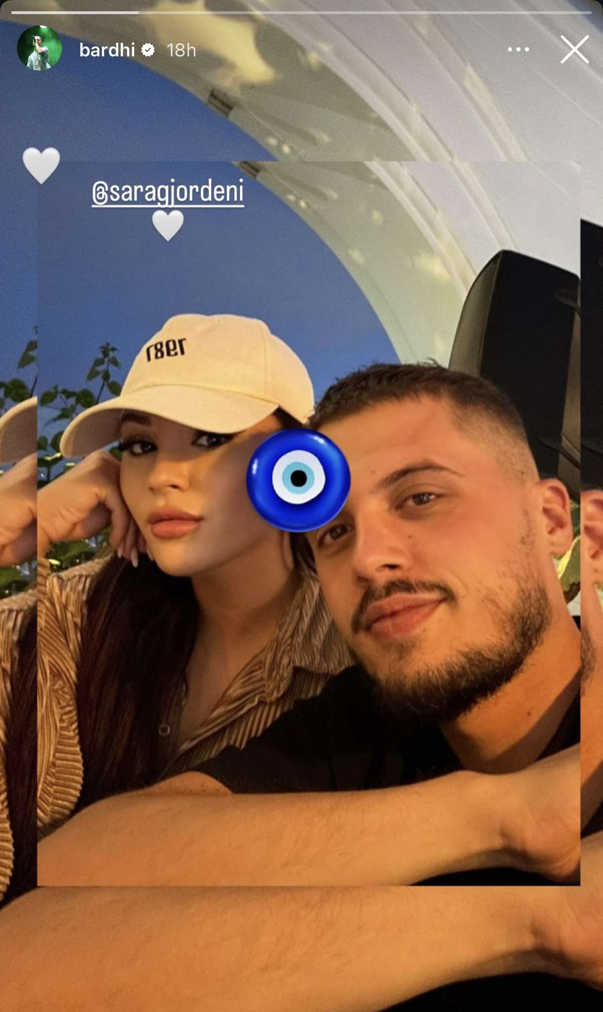 Në imazh, çifti shfaqet i buzëqeshur dhe i lumtur, ndërsa në përshkrim Bardhi ka vendosur një simbol të syrit blu, i njohur si mbrojtje kundër syrit të keq.