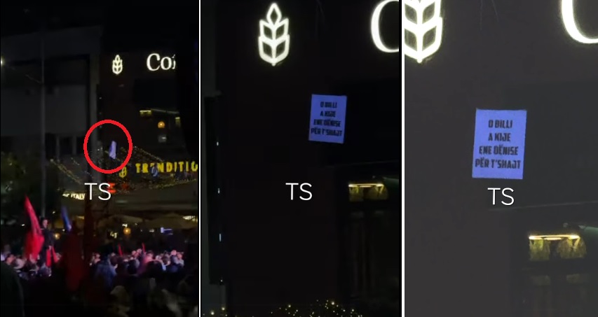 Droni mbante një pankartë me mbishkrimin: “O Billi, a kije ene dënise për te shajt?”.