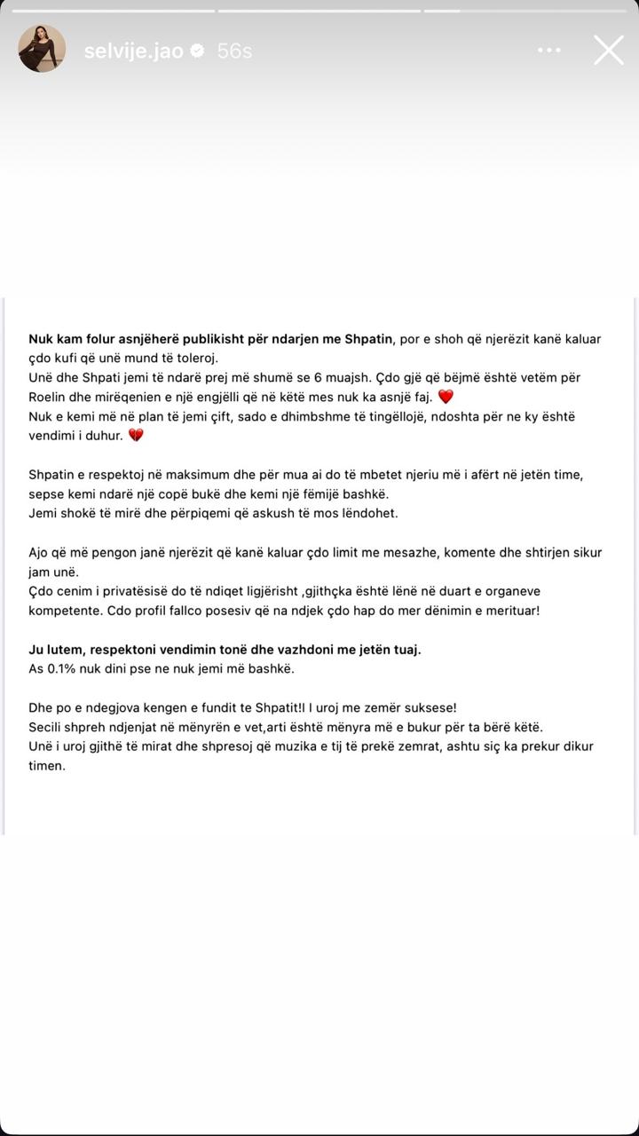 Unë dhe Shpati jemi të ndarë prej më shumë se 6 muajsh. Çdo gjë që bëjmë është vetëm për Roelin dhe mirëqenien e tij. Nuk e kemi më në plan të jemi çift, sado e dhimbshme të tingëllojë, ndoshta për ne ky është vendimi i duhur”, shkruan Selvija.