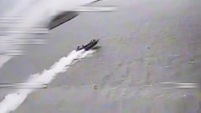 Në video shihet goditja direkte si dhe shkatërrimi i anijes që përfshihet plotësisht nga zjarri, ndërsa copat e saj shpërndahen nëpër ujë.