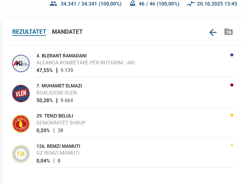 Sipas KSHZ-së, kandidati i VLEN-it, Muhamed Elmazi ka fituar 9.139 vota ose, 50,28%, ndërsa kandidati i koalicionit AKI, Blerant Ramadani, ka fituar 9.664 vota, ose 50,28%.