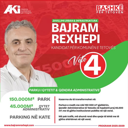 Kandidati i Aleancës Kombëtare për Integrim për Komunën e Tetovës, Bajram Rexhepi, ka prezantuar një nga projektet më ambicioze për transformimin e qytetit — shndërrimin e kazermës së vjetër në Parkun e Qytetit dhe Qendrën e Re Administrative të Tetovës informon Tetovasot.