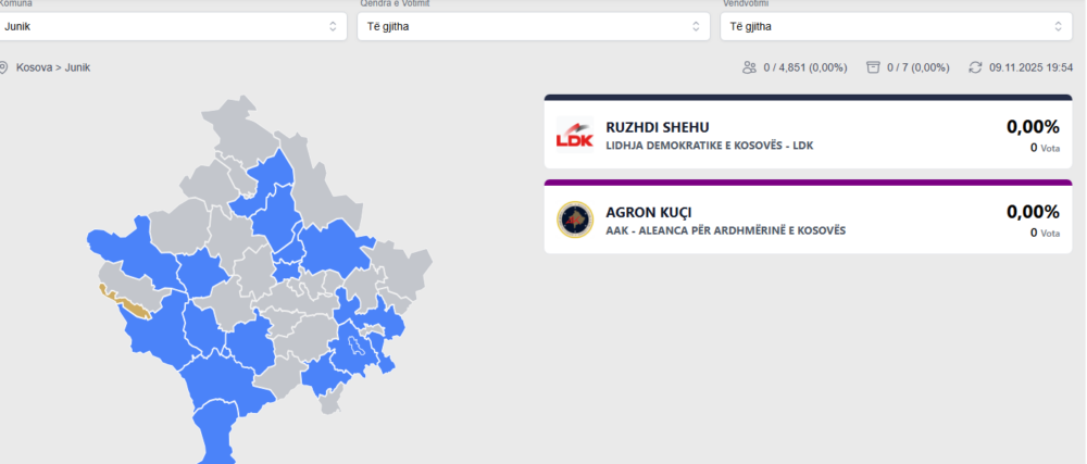 Komuna e vetme në Kosovë ku ende s’ka nisur numërimi Publikuar 20:06 9 Nëntor, 2025 Share Komuna e Junikut është e vetmja kur deri tani s’ka filluar ende numërimi i votave. Aty kanë garuar Ruzhdi Shehu i LDK dhe Agron Kuçi i AAK. Mgid