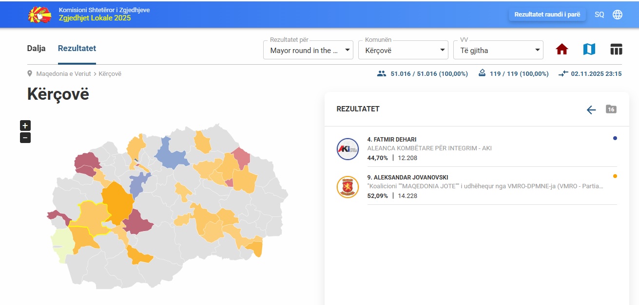 Komisioni Shtetëror Zgjedhor ka përfunduar numërimin e 100% të votave në komunën e Kërçovës. Sipas rezultateve përfundimtare, Aleksandar Jovanovski nga koalicioni “Maqedonia Jote” i udhëhequr nga VMRO-DPMNE-ja ka fituar me 52,09% të votave ose 14.228 vota.