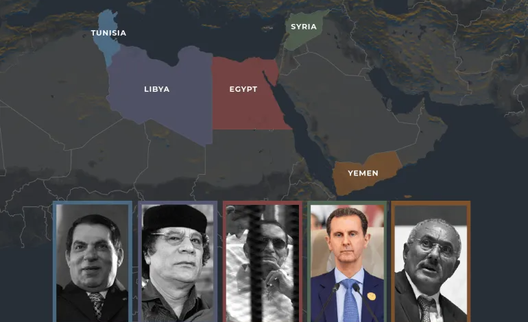 Të nxitur nga papunësia e lartë, korrupsioni i përhapur dhe mungesa e lirive politike, miliona qytetarë dolën në rrugë në vitin 2011 në vende si Egjipti, Libia, Jemeni dhe Siria. Si pasojë, pesë liderë autoritarë, që kishin sunduar për dekada, u rrëzuan nga pushteti. Sot, një dekadë e gjysmë më vonë, fati i tyre mbetet një pasqyrë e trazirave politike që përfshinë rajonin, shkruan Aljazeera.
