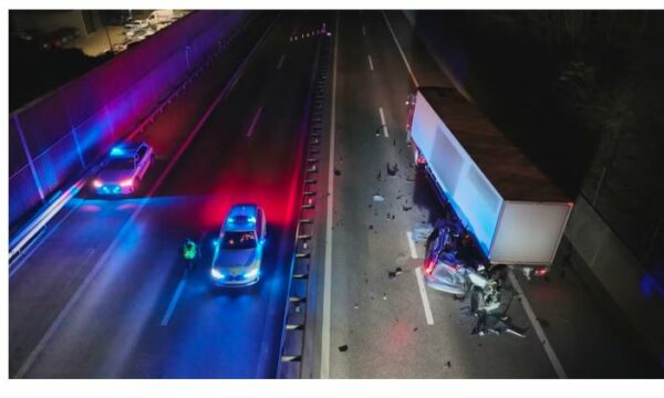 Aksidenti i parë krijoi një kolonë të gjatë trafiku, ndërsa forcat e policisë u detyruan të mbyllin një korsi për procedurat e hetimit. Pikërisht kjo situatë çoi në aksidentin e dytë tragjik, rreth orës 23:40. Një Volvo, që udhëtonte në korsinë e majtë, u përplas me shpejtësi të plotë në pjesën e pasme të një kamioni të ndalur në fund të kolonës. Përplasja e fuqishme e futi automjetin nën rimorkion e kamionit.