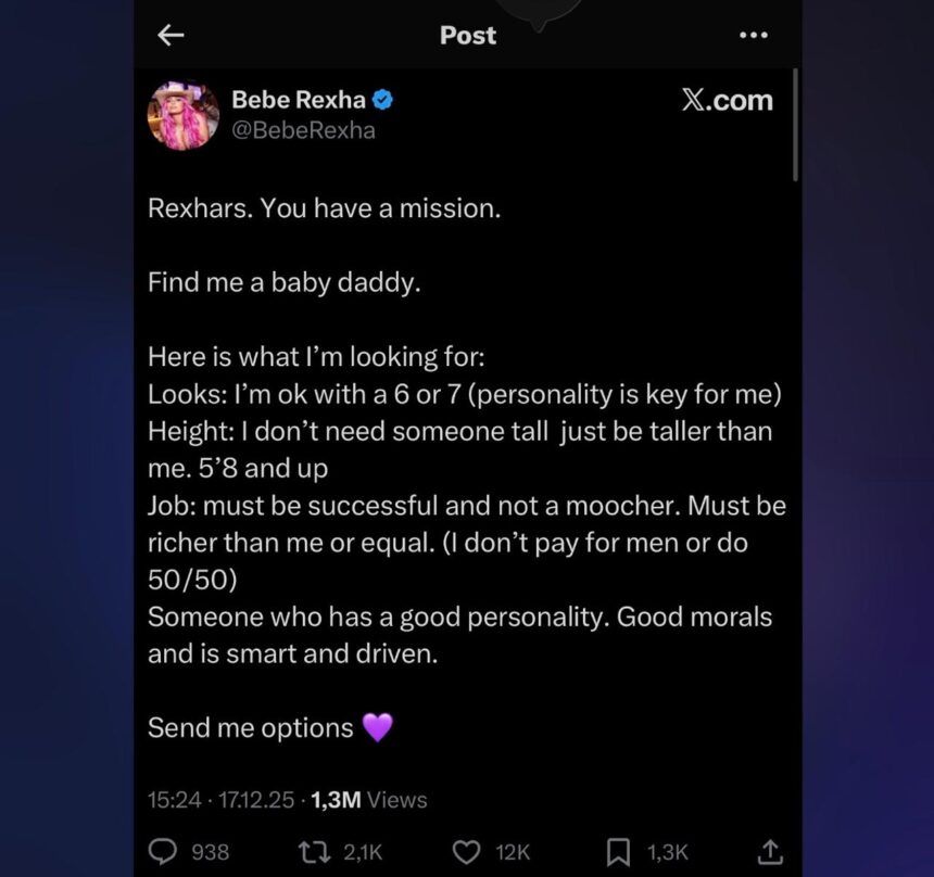 Përmes një postimi drejtuar fansave të saj, të cilët i quan “Rexhars”, ajo ka kërkuar ndihmë për të gjetur një partner, duke renditur me detaje të gjitha kriteret që ai duhet të plotësojë.