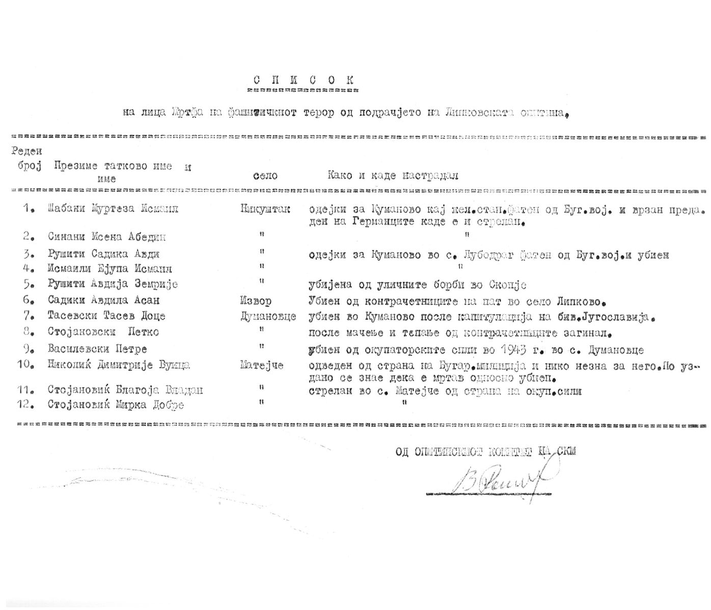 Disa persona nga fshatrat Nakushtak dhe Izvor të Likovës, të vrarë gjatë Luftës së Dytë Botërore, të cilët komunizmi i trajtoi si viktima të terrorit fashist. Dokumenti është i vitit 1964 i nënshkruar nga Bexhet Rramani, Komiteti Komunal i Lidhja Komuniste e Maqedonise (LKM).