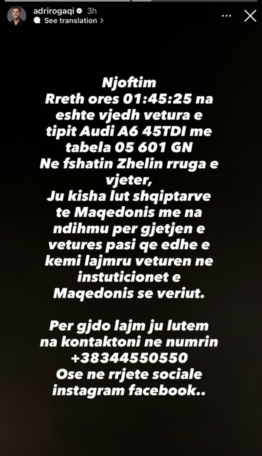 “Ju kisha lut shqiptarëve të Maqedonisë me na ndihmu për gjetjen e veturës pasiqë edhe e kemi lajmëru veturën në institucione”, ka shkruar ai.