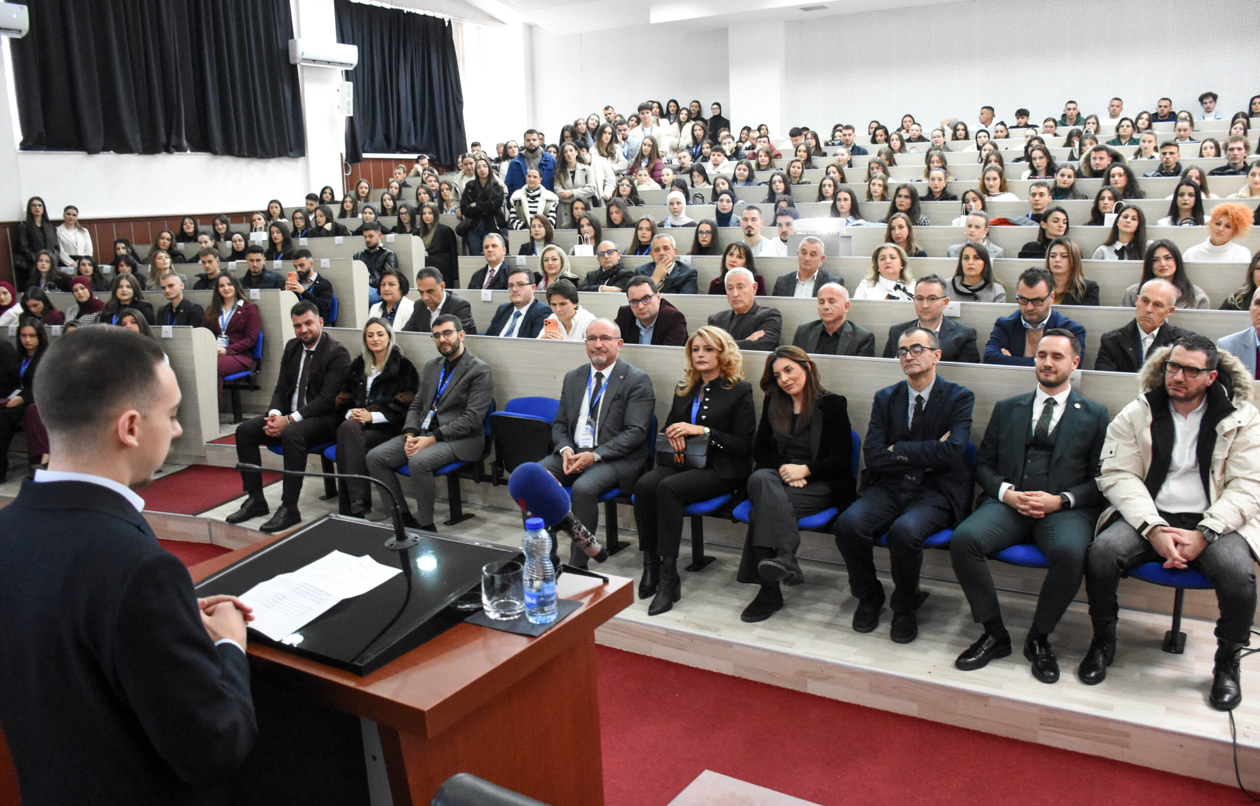 “Ky është një eveniment që ka sjellë studentë nga fusha të ndryshme për të krijuar ura bashkëpunimi, miqësie dhe rrjete profesionale që do të zgjasin përtej ambienteve universitare. Ky është një shkëmbim idesh dhe përvojash, ku mund të zhvillohemi jo vetëm si individë, por edhe si pjesë e një shoqërie akademike më të gjerë. Fati ynë është që sot nuk e fillojmë gjithçka nga e para; hapat e parë u hodhën vitin e kaluar me Konferencën e Parë Studentore. Dhe, ndërsa ata vendosën themelet, ne sot kemi përgjegjësinë ta vazhdojmë këtë traditë dhe ta bëjmë Konferencën e Dytë Studentore edhe më të vlefshme, më të organizuar dhe më të ndikueshme sesa e para, sepse ajo ndërtohet mbi përvojën dhe mësimet e edicionit të kaluar. Asgjë nga kjo që shihni sot nuk është vepër e një personi të vetëm. Dua t’i falënderoj nga zemra ekipin organizativ të konferencës, ekipin e Kuvendit Studentor që pranoi sfidën dhe nuk tha “është e pamundur”, por “le ta provojmë”, profesorët dhe mentorët që besuan te ne, si dhe stafin administrativ që është kujdesur për detajet që nuk duken, por që ndihen kur mungojnë. Një konferencë studentore nuk është thjesht një aktivitet i përkohshëm, as një ngjarje formale që kryhet çdo vit. Ajo është një hapësirë ku idetë marrin jetë, ku zërat tanë dëgjohen dhe ku ne, si të rinj, marrim përgjegjësi në formësimin e së ardhmes. Këtu nuk kemi vetëm abstrakte dhe prezantime; kemi ide që kanë lindur në auditorë, në praktikat klinike, në projekte dhe në biseda mes kolegësh. Ato na lejojnë të artikulojmë problemet që shohim, të propozojmë zgjidhje dhe të tregojmë se brezi ynë ka potencial, kreativitet dhe vizion. Ato na fuqizojnë që të kemi rol aktiv në ndryshimin që duam të shohim. Të dashur studentë, pjesëmarrja në një konferencë është një investim në vetveten. Ajo është një mundësi për të mësuar, për të rritur besimin në aftësitë tuaja dhe për të hedhur hapat e parë drejt një rrugëtimi profesional të suksesshëm. Le ta shfrytëzojmë këtë konferencë si një platformë për të ndarë njohuri, për të sfiduar veten dhe për të krijuar një të ardhme më të ndritur.”- tha Kryetari i Parlamentit Studentor të UT-së, Leart Ibraimi.