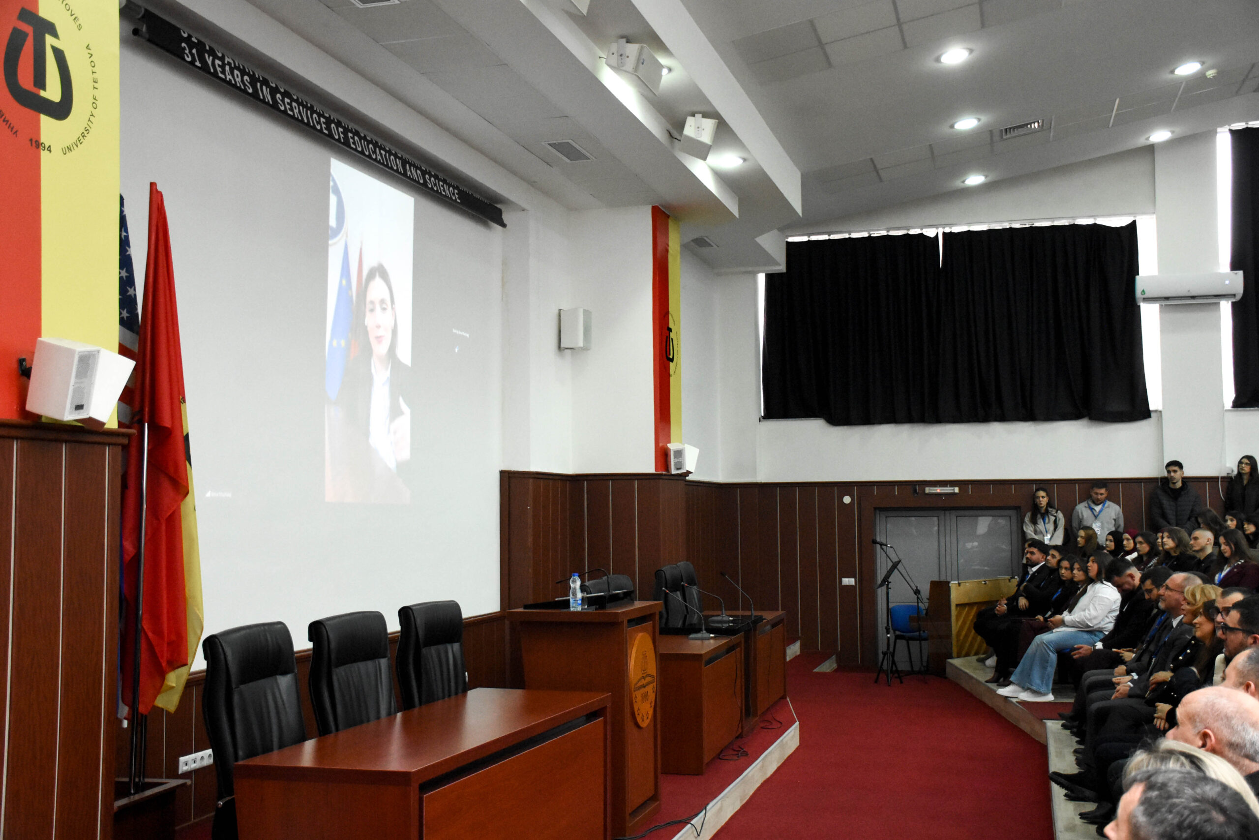 Në fjalën e tij, Prorektori për Shkencë, Prof. Dr. Vullnet Ameti, theksoi dimensionin historik dhe identitar të Universitetit të Tetovës. Ai rikujtoi se UT-ja nuk është vetëm qendër akademike, por simbol i një rrugëtimi të gjatë për dije, liri dhe dinjitet kombëtar. “LIRIA NUK ËSHTË E LIRË. Në bazë të kësaj premise u ruajt, u ringrit dhe u mbajt gjallë Universiteti i Tetovës. Sepse nuk ishte mrekulli por sakrificë dhe nuk ishte dhuratë por vendosmëri. Kur flasim për Universitetin e Tetovës, nuk flasim vetëm për një institucion akademik. Flasim për një histori të tërë rezistence. Arsimimi në gjuhën shqipe nuk ka qenë vetëm e drejtë — ka qenë akt emancipimi, akt vetëmbrojtjeje dhe akt lirie. Edhe vetë Lea Ypi filozofja e shquar shqiptare dhe autorja e kryeveprës “Të lirë” tha: “Universiteti i Tetovës është shëmbëlltyra dhe realizimi i idesë së kërkimit të lirisë.” Ka pasur momente kur fati i Universitetit ishte i lidhur ngushtë me fatin e kombit. Momente kur Universiteti nuk ishte vetëm vend i dijes, por vend i rezistencës; vend ku çlirohej vullneti i ndrydhur; vend ku akumulohej energjia për t’u përballur me padrejtësinë. Sa më shumë që rritej presioni për ta ndalur arsimin shqip, aq më shumë rritej vendosmëria për të mos u dorëzuar. Sa më shumë që mohohej e drejta për dije, aq më qartë kuptohej se liria dhe arsimi ecin gjithmonë bashkë. Universiteti i Tetovës u ringrit dhe u mbajt gjallë jo vetëm nga mësimdhënësit e tij, por nga populli që e themeloi; nga studentët që hynin nëpër auditorë edhe kur auditorët ishin të rrethuar; nga familjet që i hapën shtëpitë e tyre si klasa; nga një ide e pandalshme se dija, një ditë, do t’i hapte popullit tonë rrugë drejt lirisë, zhvillimit dhe dinjitetit. Sot, në Konferencën e dytë studentore, kujtojmë se UT nuk është thjesht universitet — është akt historik. Edhe Parlamenti Studentor i UT-së nuk është thjesht një strukturë përfaqësimi — por motori dhe promotori i brezit që beson se e ardhmja ndërtohet me punë.” – theksoi Prorektori për Shkencë, Prof. Dr. Vullnet Ameti.