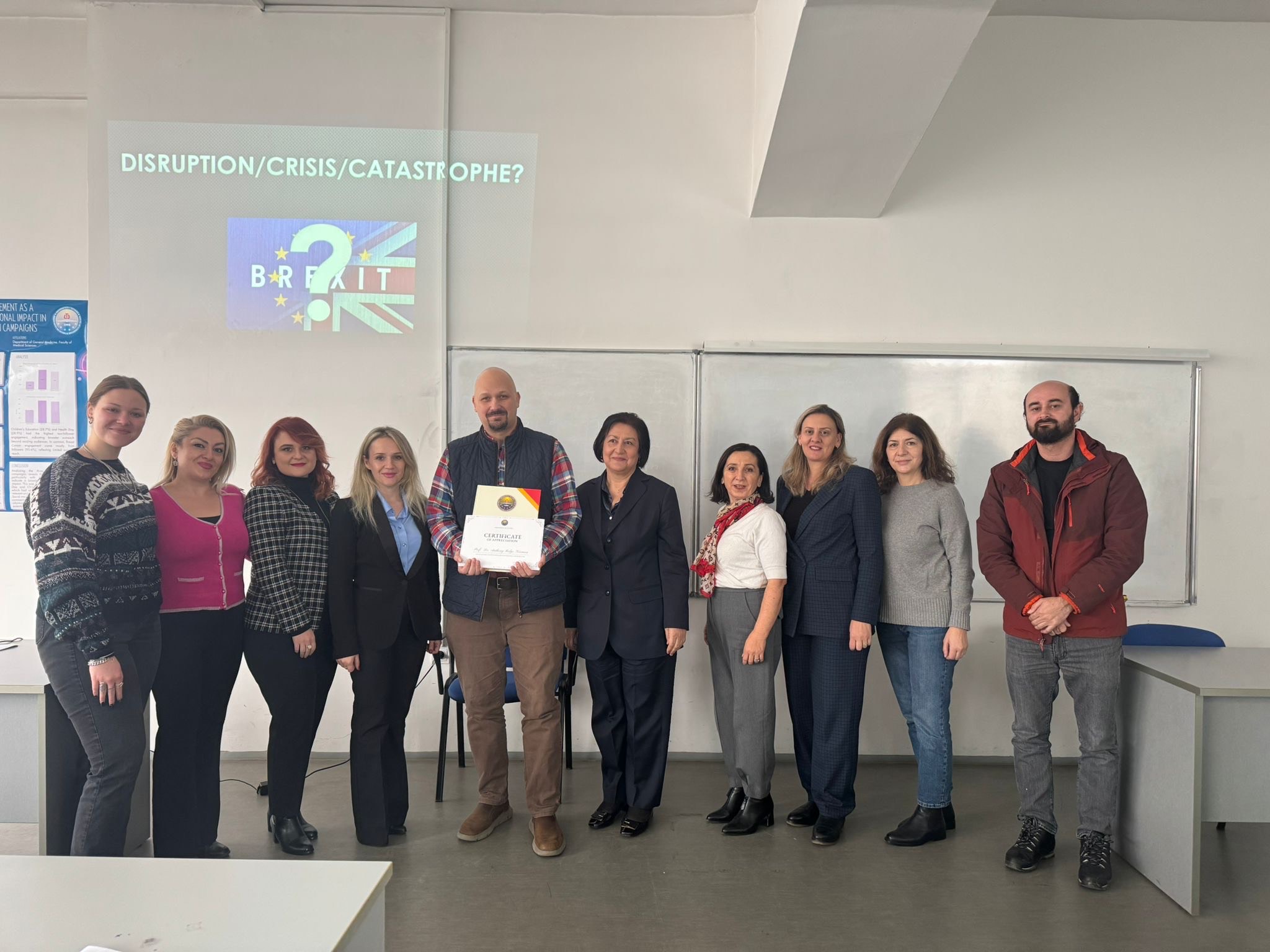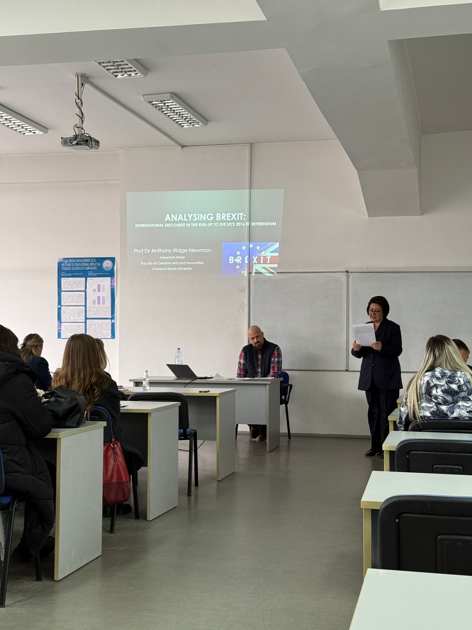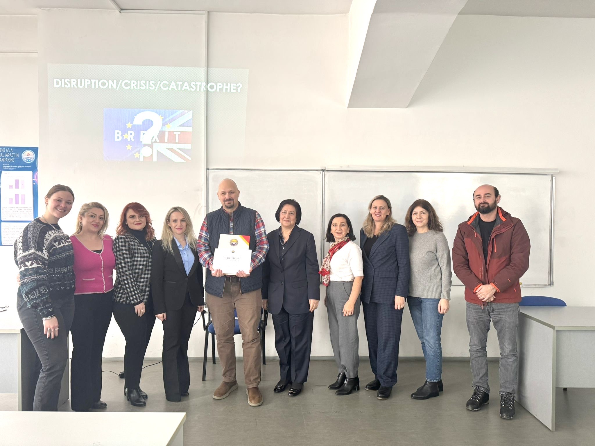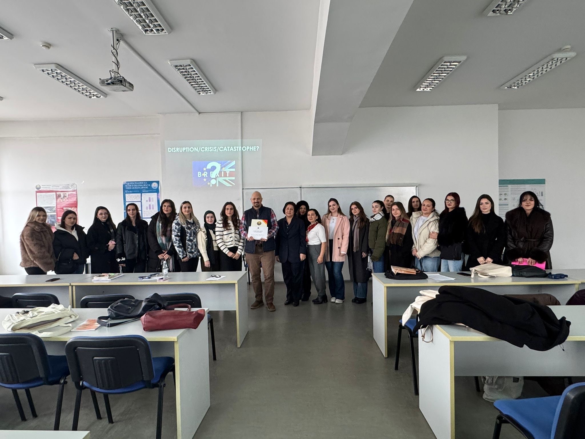 Ligjërata u organizua në ambientet e Fakultetit Filologjik dhe u ndoq me interes nga studentët, stafi akademik, duke sjellë një analizë mbi diskursin politik dhe ndërkombëtar që i parapriu referendumit të vitit 2016 në Mbretërinë e Bashkuar, si dhe pasojat e këtij procesi për Evropën dhe marrëdhëniet ndërkombëtare.