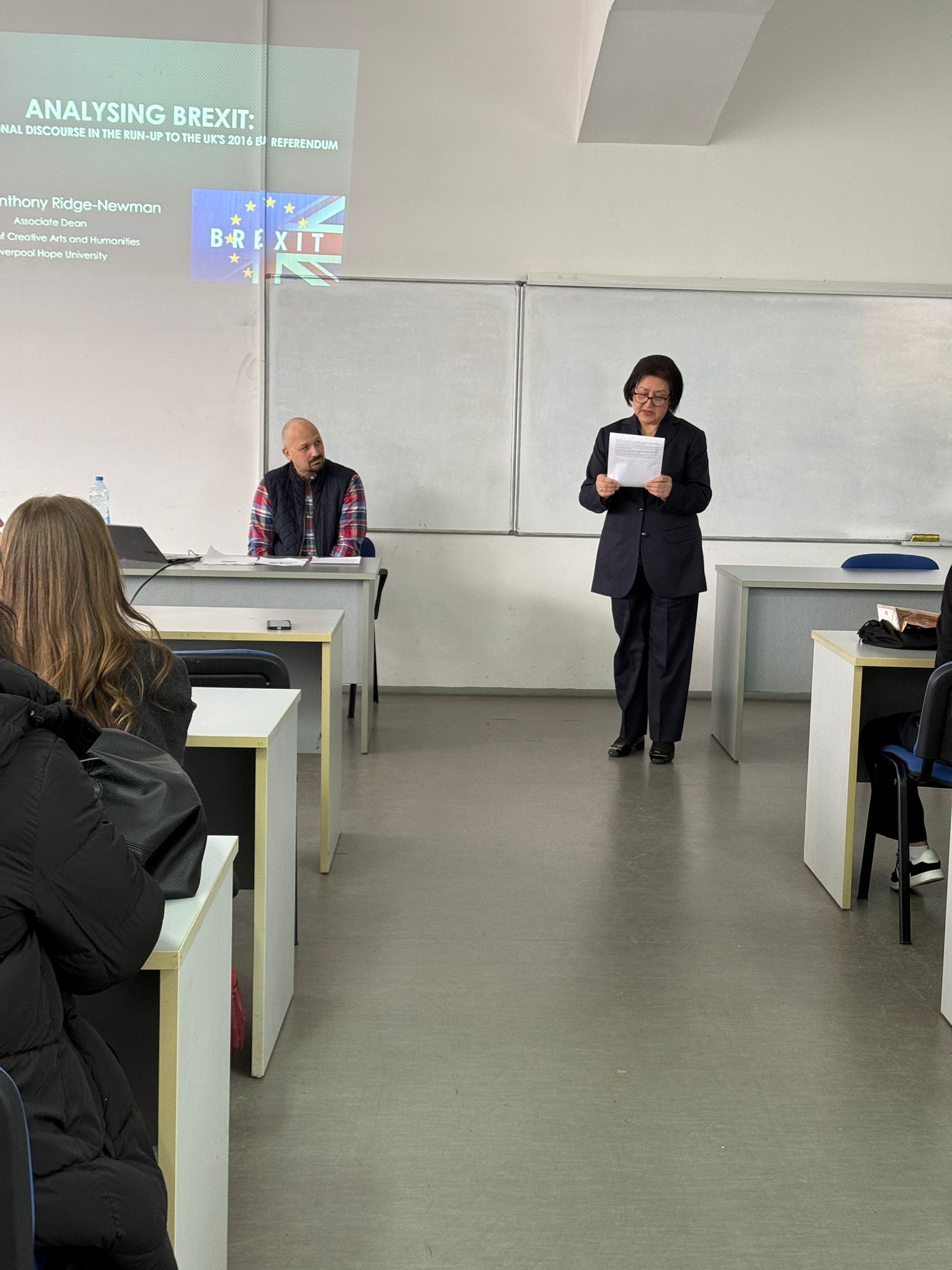 Në fjalën e saj përshëndetëse, dekania e Fakultetit Filologjik, Prof. Dr. Emine Shabani, e vlerësoi praninë e profesorit Ridge-Newman, duke theksuar se ajo përbën një dëshmi të rëndësisë së bashkëpunimit akademik ndërkombëtar dhe të shkëmbimit të ideve. Ajo theksoi se universitetet nuk janë vetëm hapësira mësimi, por edhe ura që lidhin perspektiva të ndryshme, kultura akademike dhe mënyra të të menduarit kritik e kreativ. Sipas saj, përvoja historike e Brexit-it ka ndikuar jo vetëm në Mbretërinë e Bashkuar, por edhe në të ardhmen e Evropës dhe më gjerë, duke hapur debate të thella mbi sovranitetin, integrimin evropian, identitetin kombëtar dhe marrëdhëniet ndërkombëtare.