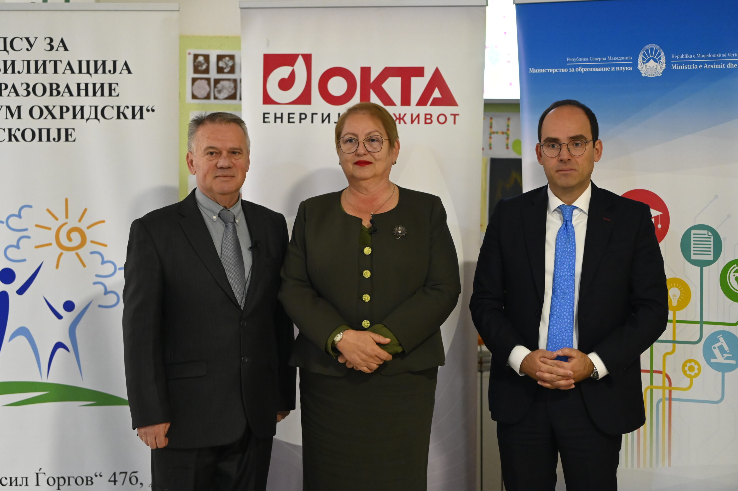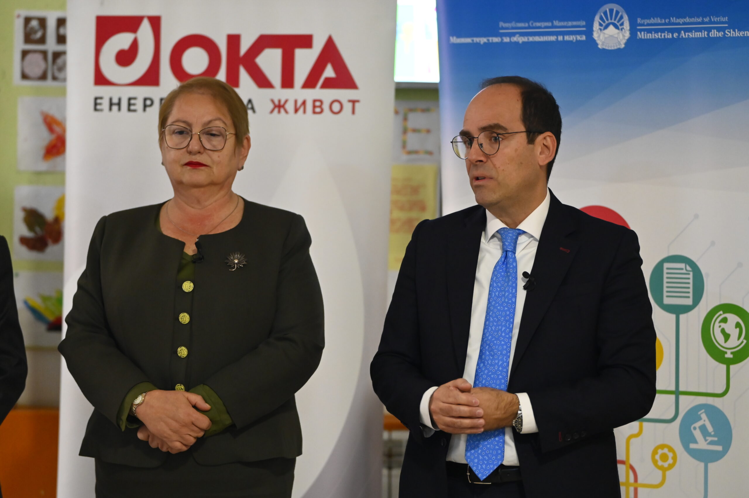 „OKTA është ndër partnerët e MASH-it që ndihmojnë në avancimin e sistemit arsimor. Gjatë disa muajve të fundit ka investuar në sisteme fotovoltaike në disa institucione arsimore, ndër të cilat edhe tre shkolla shtetërore – „Naum Ohridski“ në Shkup, „Iskra“ në Shtip dhe „Koço Racin“ në Manastir. Këto sisteme do të sigurojnë energji të pastër dhe kursim të mjeteve financiare, të cilat do të mund të ridestinohen për nevoja të tjera të rëndësishme-për përmirësimin e infrastrukturës, për furnizimin me mjete mësimore dhe teknologji asistive“, tha Janevska.