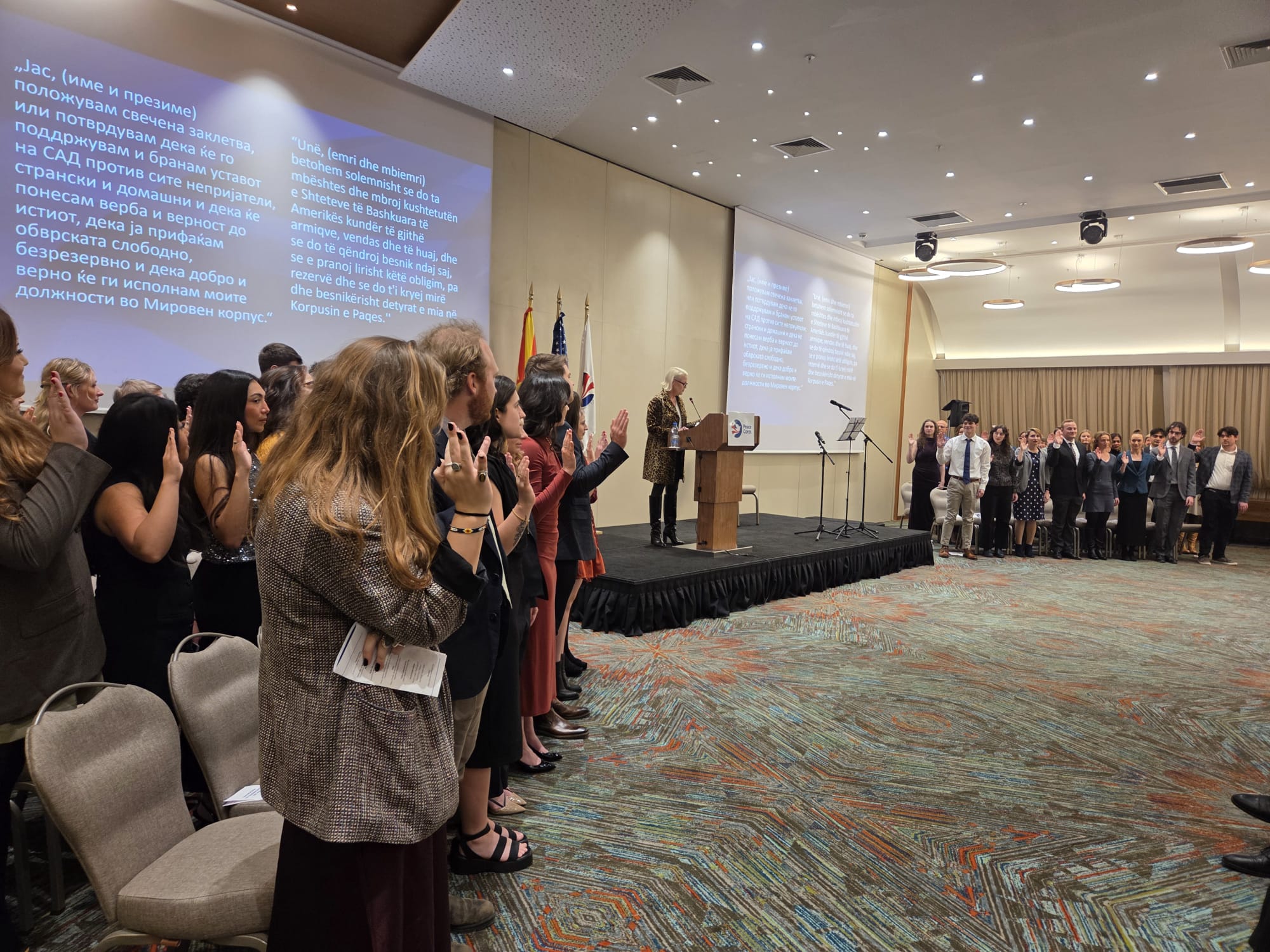 Grup i ri prej 48 vullnetarësh amerikanë të Korpusit të Paqes, gjatë dy viteve të ardhshme, do të angazhohet në shkolla në Maqedoni dhe do të ndihmojë në përforcimin e aftësive gjuhësore të nxënësve dhe në zhvillimin e mjedisit shkollor më gjithëpërfshirës. Vullnetarët sot dhanë betim solemn në prani të Presidentes së vendit, Prof. Dr. Gordana Siljanovska Davkova, ministrave të Arsimit dhe Shkencës dhe Vetëqeverisjes Lokale, Prof. Dr. Vesna Janevska dhe Zllatko Perinski, ambasadores së SHBA-së Anxhela Ageler, drejtorit të Korpusit të Paqes, Dejvid Risajd dhe kryetarëve të komunave dhe drejtorëve të shkollave.