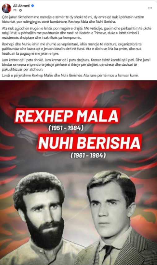 “Lavdi e përjetshme Rexhep Malës dhe Nuhi Berishës. Ata ranë për të mos u harruar kurrë,” përfundon mesazhin e tij Ali Ahmeti.