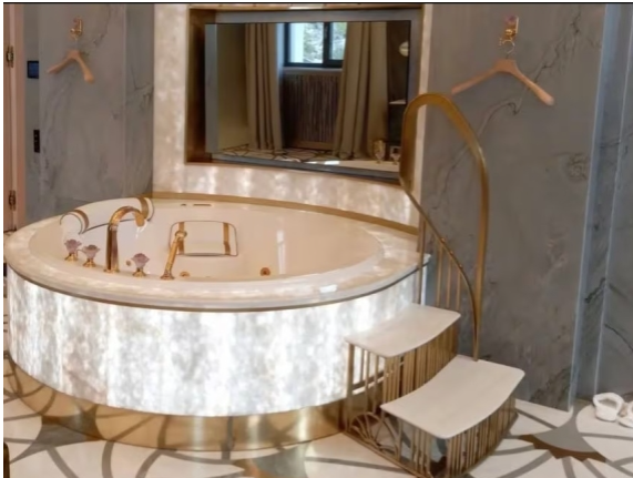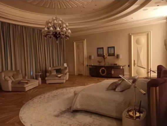Brendësia e vilës përshkruhet si jashtëzakonisht luksoze. Dy suita martesore, secila me sipërfaqe rreth 240 metra katrorë, janë të pajisura me banja private prej 50 metrash katrorë. Sipas investigimit, vetëm arredimi i një banje kushton rreth 120 mijë euro dhe përfshin xhakuzi dhe elementë dekorativë të veshur me ar, si dhe vaska speciale me çmim rreth 32 mijë euro secila.