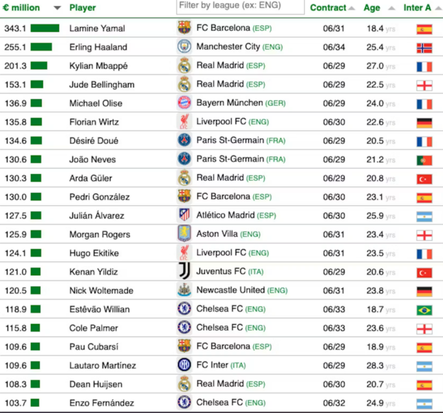 Në mesin e brazilianëve, më i vlefshmi është Estêvão i Chelseat me 118.9 milionë euro, i ndjekur nga João Pedro dhe Savinho. Ndërkohë, Vinícius Júnior ka rënë jashtë Top 30, duke u renditur në vendin e 38-të me 90.3 milionë euro.