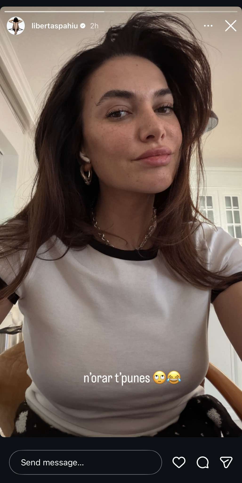 Në postimin e fundit, ajo ka ndarë një fotografi ku shfaqet gjatë orarit të punës, të shoqëruar me mbishkrimin “N’orar t’punes”.