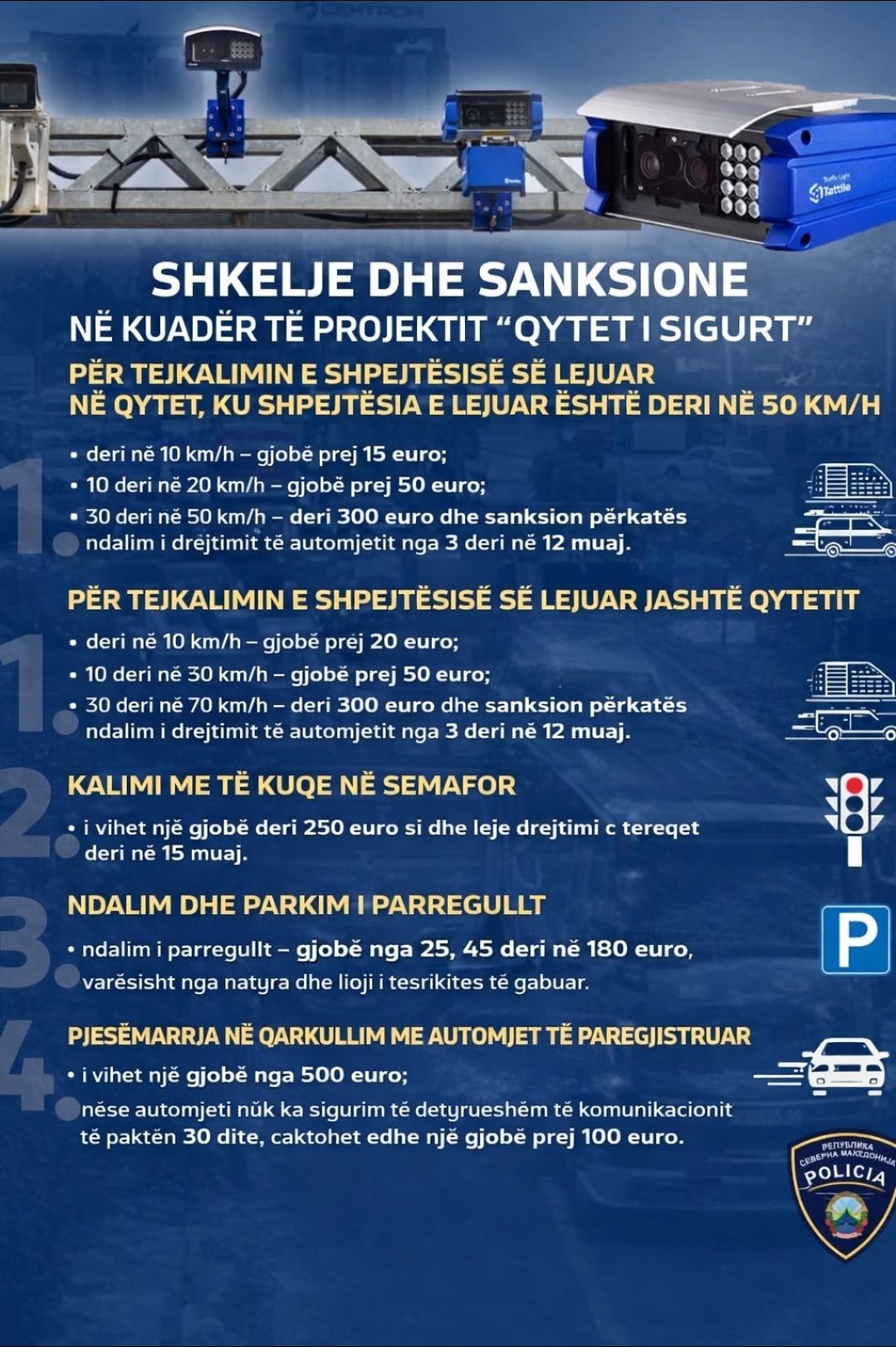 Me qëllim të rritjes së sigurisë në komunikacion dhe zbatimit të denjë të ligjeve, Ministria e Punëve të Brendshme i informon qytetarët për kundërvajtjet që sanksionohen përmes sistemit “Qyteti i Sigurt” dhe gjobat e parashikuara. ________________________________________