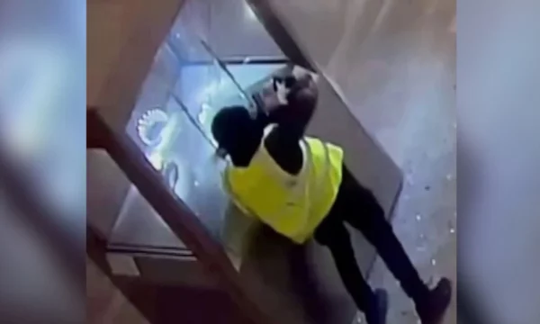 I veshur me një jelek të verdhë dhe me të zeza, ai më pas shkon drejt bashkëpunëtorit të tij për ta ndihmuar të çmontojë një vitrinë të dytë në mënyrë që të heqë marrë sende të tjera të vlefshme.