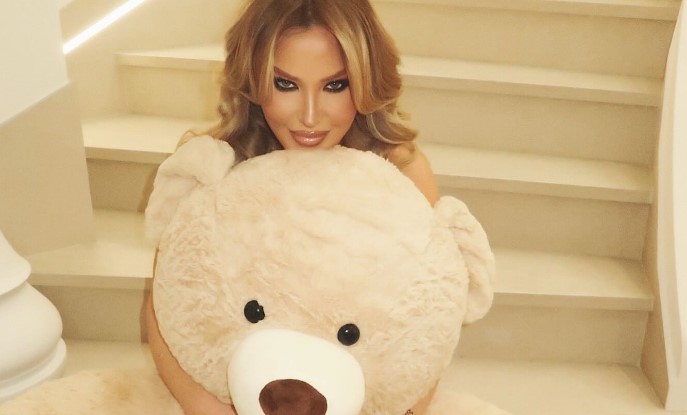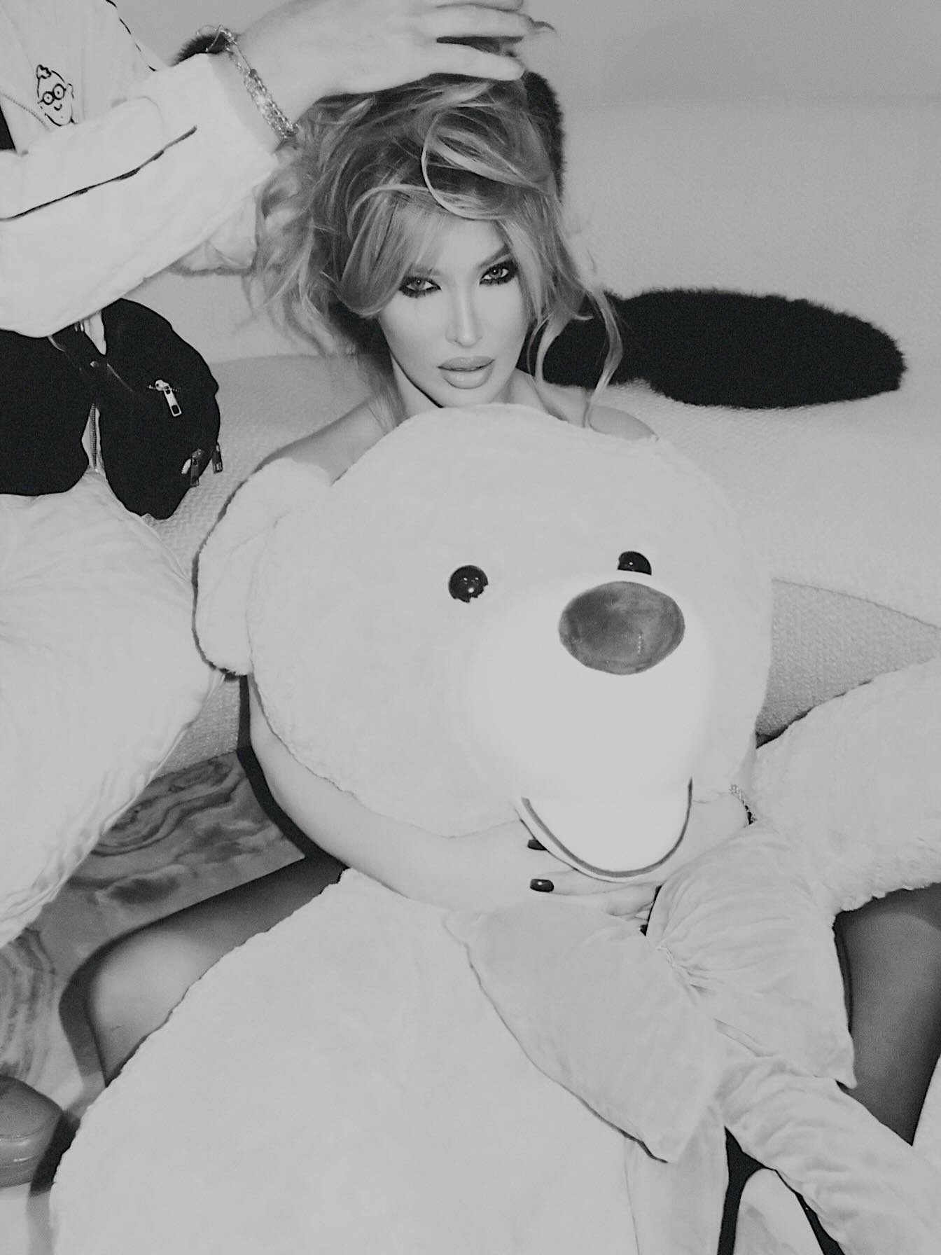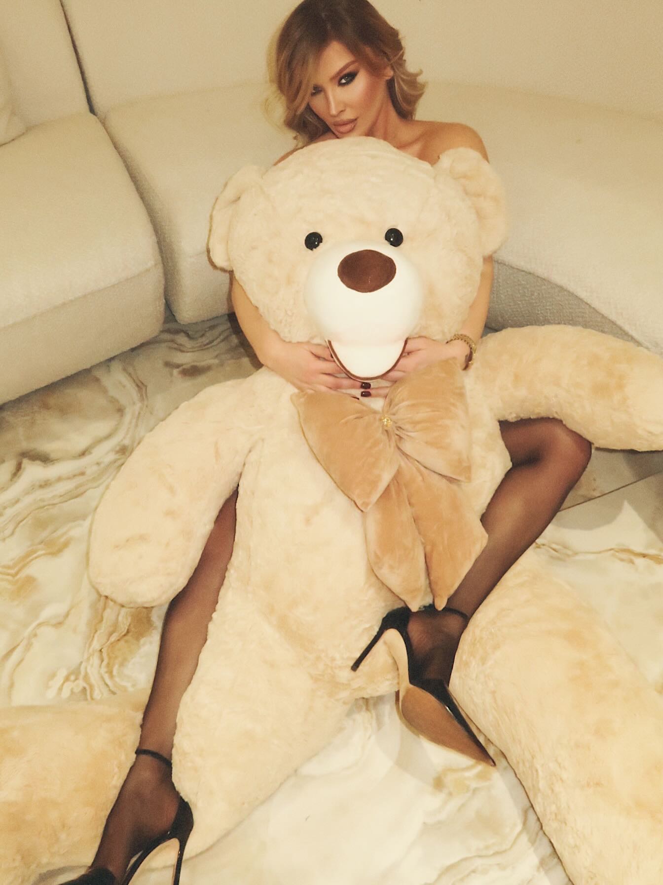 Ajo është shfaqur me grim dhe me një arush prej pelushi, që e mban në përqafim.