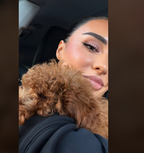 Në imazhin e publikuar, Xhensila shfaqet duke e mbajtur pranë qenushin e saj.