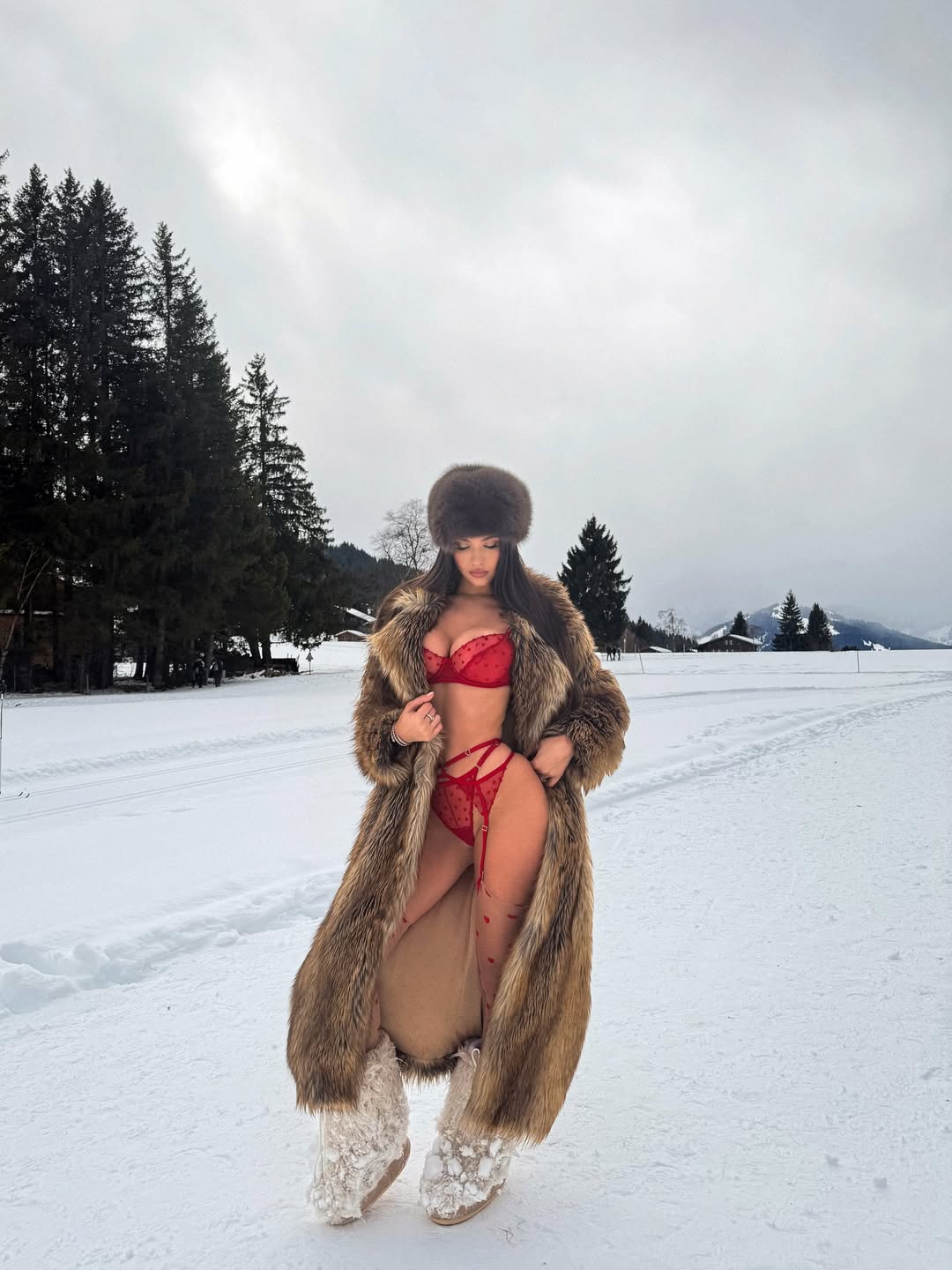 Në këtë postim, Oriola zgjedh të kombinojë sensualitetin me natyrën e ftohtë të dimrit, duke krijuar një kontrast që të lë pa fjalë. Duket sikur po i sfidon elementët e natyrës për të treguar se edhe në kushte ekstreme, shkëlqimi i saj nuk mund të zbehet.