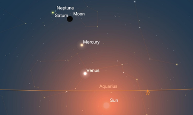 Pas 17 shkurtit, me Hënën e Re, duke parë drejt perëndimit, do të jetë e mundur të vëzhgoni gjysmëhënën bashkë me trekëndëshin e planetëve.