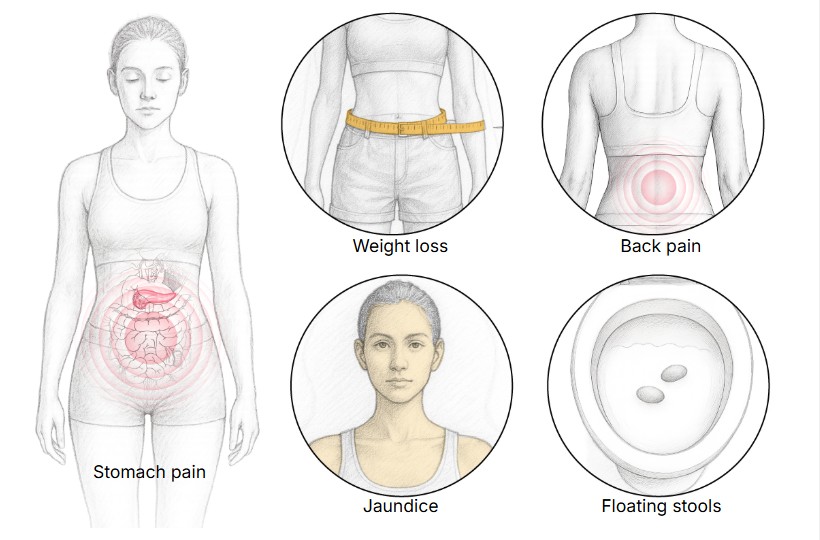 Simptomat më të zakonshme përfshijnë verdhëzën, humbjen e oreksit dhe peshës, lodhjen, temperaturën, të përzierat, diarrenë dhe kapsllëkun – shpesh kur sëmundja është tashmë në fazë të avancuar.